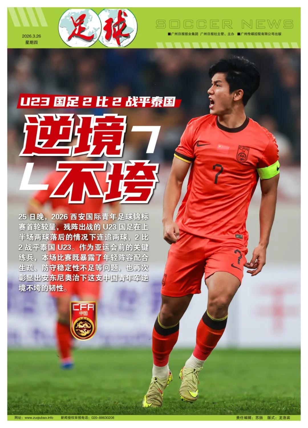 記者魯蜜西安報道 25日晚,西安國際足球中心迎來2026西安國際青年足球錦標賽首輪較量,中國U23男足迎戰泰國U23。受國家隊徵調影響,球隊以U23亞洲盃替補與大量U21新人組成的“殘陣”出戰。上半場球隊失誤連連,0比2落後,下半場主帥安東尼奧精準調整,向餘望、李新翔先後破門扳平比分,最終以2比2平局完場。儘管上半場球隊表現仍有諸多不足,但值得慶幸的是,小夥子們將U23亞洲盃上鐵血精神延續至今,再次展現出中國足球青年軍的韌勁。