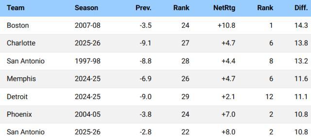 截至今日賽前,黃蜂本賽季百回合淨勝對手4.7分,排在聯賽第6。要知道上賽季黃蜂還以-9.1的百回合淨勝分排名聯盟倒數第4。短短一年時間,黃蜂將百回合淨勝分提升了13.8分,這在NBA進入play-by-play數據時代的30年裏高居第二,僅次於2007-08賽季組成加內特、皮爾斯、雷·阿倫三巨頭的凱爾特人(提升14.3分)。