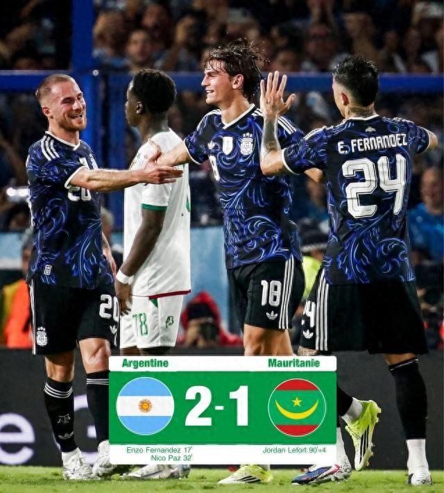 27日對毛里塔尼亞一戰,主帥斯卡洛尼派出了主力和替補混編的首發陣容,大馬丁、莫利納、羅梅羅、恩佐、麥卡利斯特、阿爾瓦雷斯等冠軍主力班底首發,上半場梅西和德保羅都在替補席待命,下半場才替補上陣,同時換上了大部分新面孔。最終憑藉上半時恩佐和尼科·帕斯的進球,阿根廷2比1戰勝對手。