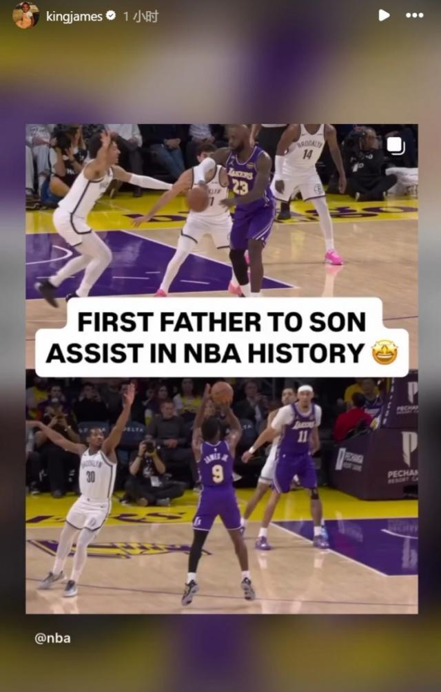 賽後,詹姆斯也更新個人社交媒體轉發了這一瞬間並寫道:“NBA歷史首個父親爲兒子送出的助攻。”