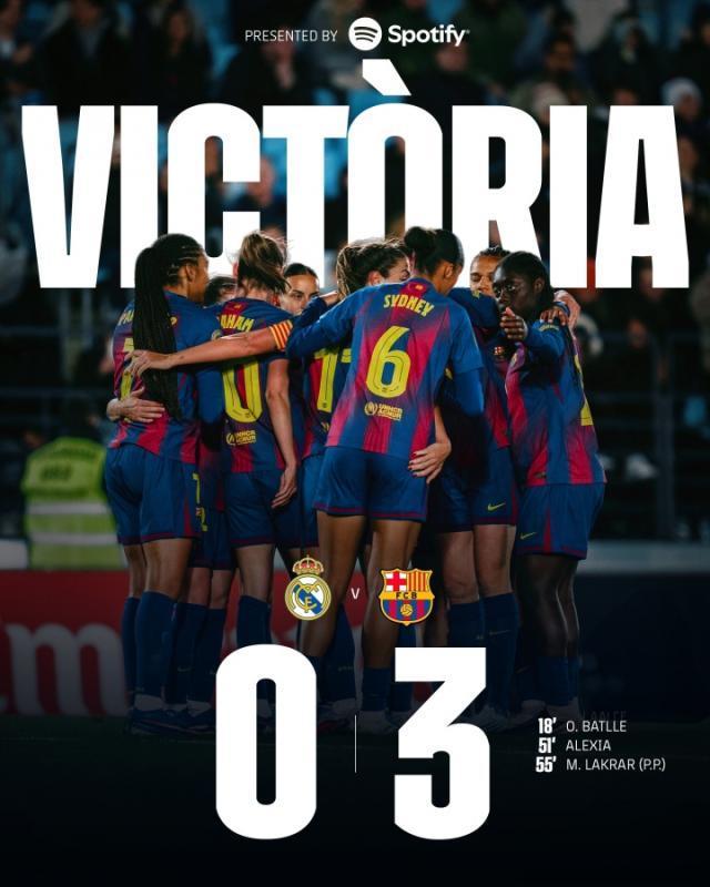 西班牙女足超級聯賽第24輪比賽,巴薩女足客場3比0完勝皇馬女足,巴特勒和普特拉斯分別建功,皇馬女足打進一粒烏龍球。此役過後,巴薩女足在聯賽積分榜上繼續擴大領先優勢,目前已經領先對方13分。近一週巴薩女足和皇馬女足將連續對陣三次,其中包括兩回合歐冠1/4決賽和本場聯賽較量。首回合歐冠1/4決賽,巴薩女足6比2大勝皇馬女足,此役再次3比0完勝。雙方之間的歐冠1/4決賽次回合將於4月3日進行。