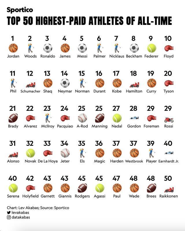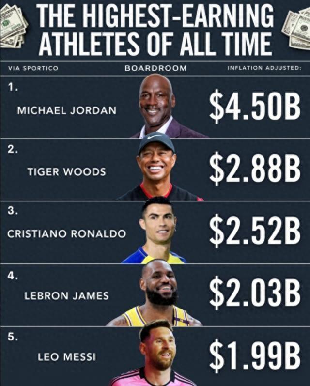 在喬丹之後,排名第二的是高爾夫運動員“老虎”伍茲,總收入28.8億美元。第三是足球運動員C羅,收入爲25.2億美元。第四又是籃球運動員,爲總收入20.3億美元的勒布朗·詹姆斯。