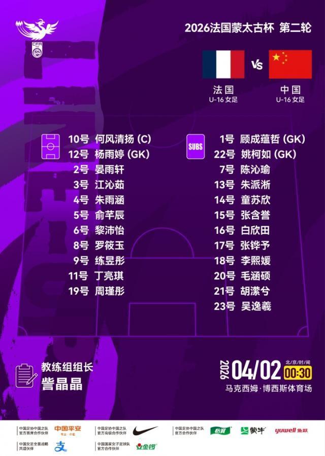 北京時間4月2日00:30,蒙太古女杯小組賽A組第2輪,中國女足U16在法國馬克西姆·博西斯體育場對陣法國女足U16。上半場,周瑾彤憑藉任意球直接破門爲中國隊取得領先;下半場開場,何風清揚禁區內停球轉身低射擴大比分,隨後法國隊依靠點球扳回一城。最終,中國女足U162比1擊敗法國女足U16。小組賽第三輪,中國女足U16將在北京時間4月4日00:30對陣墨西哥女足U16,法國女足U16則將對陣英格蘭女足U16。