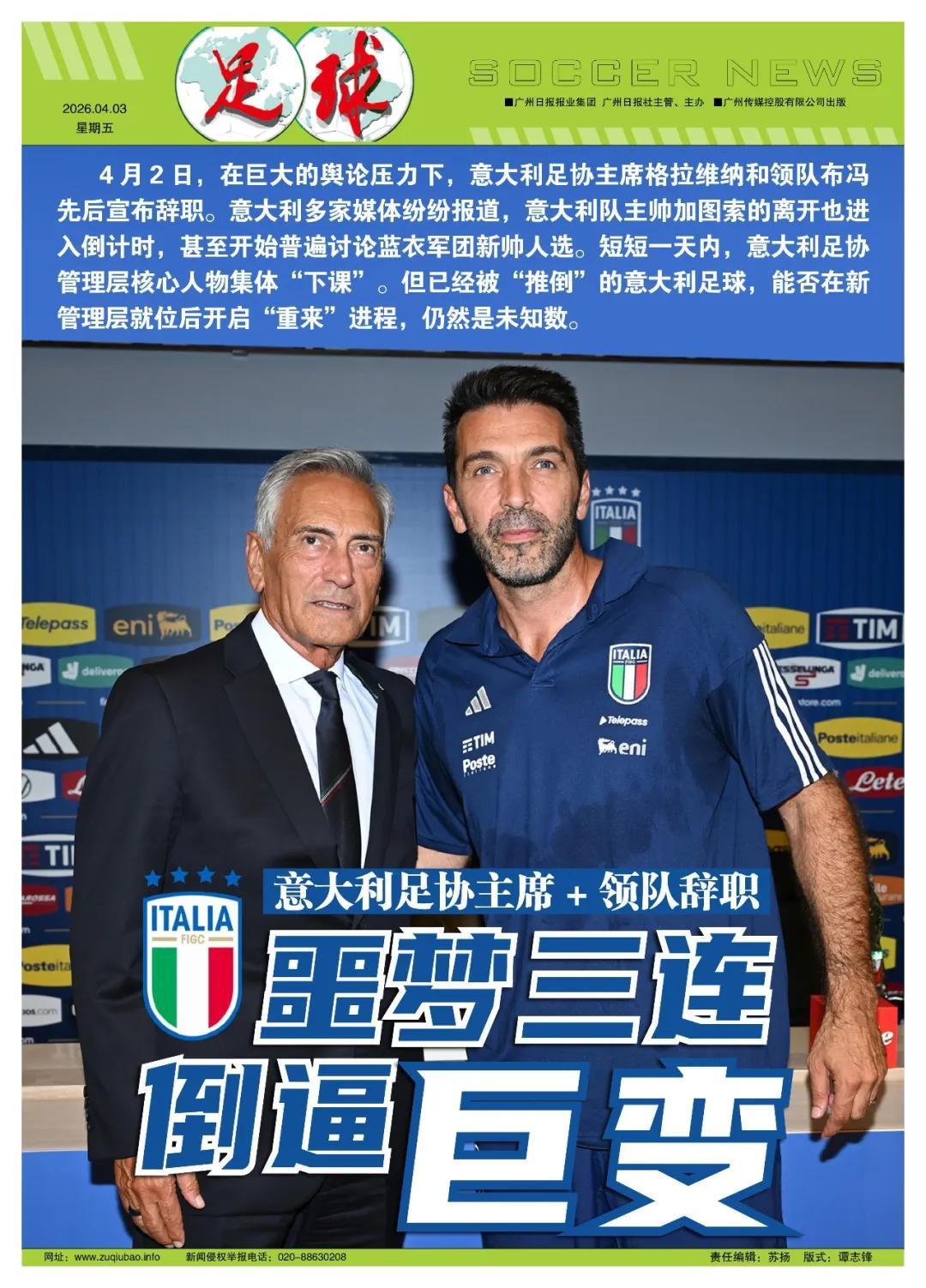 撰稿/寒冰 連續3次無緣世界盃,終於迫使意大利足壇發生最激烈的鉅變。4月2日,在巨大的輿論壓力下,意大利足協主席格拉維納和領隊布馮先後宣佈辭職。意大利多家媒體紛紛報道,意大利隊主帥加圖索的離開也進入倒計時,甚至開始普遍討論藍衣軍團新帥人選。短短一天內,意大利足協管理層核心人物集體“下課”。但已經被“推倒”的意大利足球,能否在新管理層就位後開啓“重來”進程,仍然是未知數。