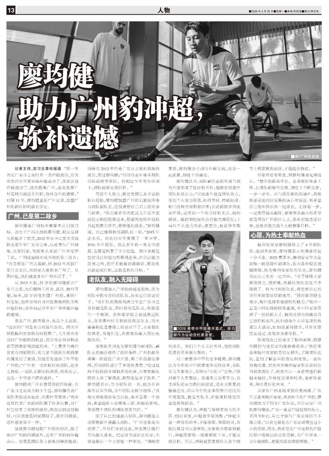 記者王偉、實習生李信報道 “那一年我在廣東日之泉時差一點衝超成功,後來我在河北華夏幸福衝超成功了,在武漢也衝超成功了,這次回來廣州,就是想幫廣州足球完成這個目標,彌補當年的遺憾。”時隔11年,廖均健重返廣州足球,加盟廣州豹的目標明確且堅定。