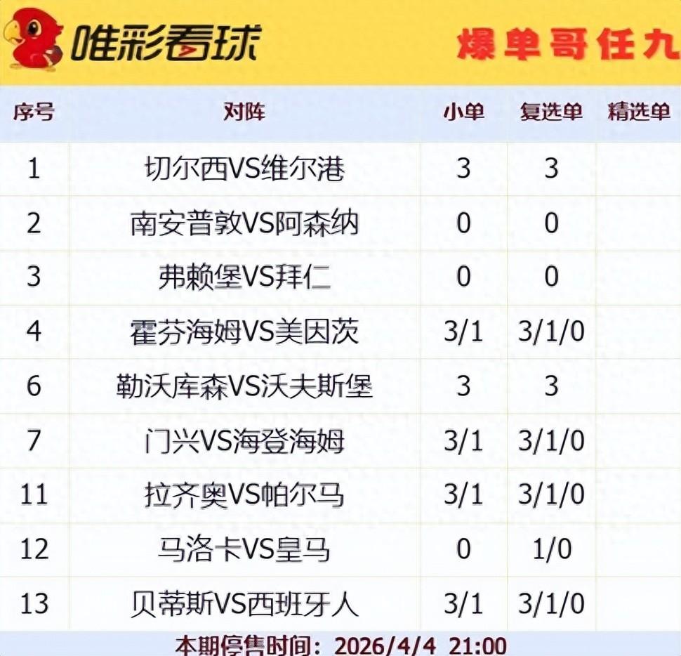 ⚽⚽ 點擊本段文字查看爆單哥精選任九方案,涵蓋多聯賽冷門分析,優化組合策略完整呈現。
