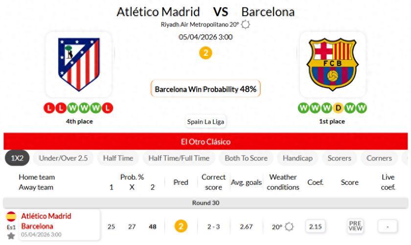 馬競本賽季29輪積57分排名西甲第四,落後榜首巴薩16分,仍保留衝擊歐冠區資格,戰意充足。