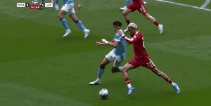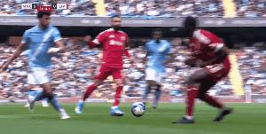 第39分鐘,範戴克禁區內放倒奧賴利,主裁判罰點球。哈蘭德主罰命中,曼城1比0領先。