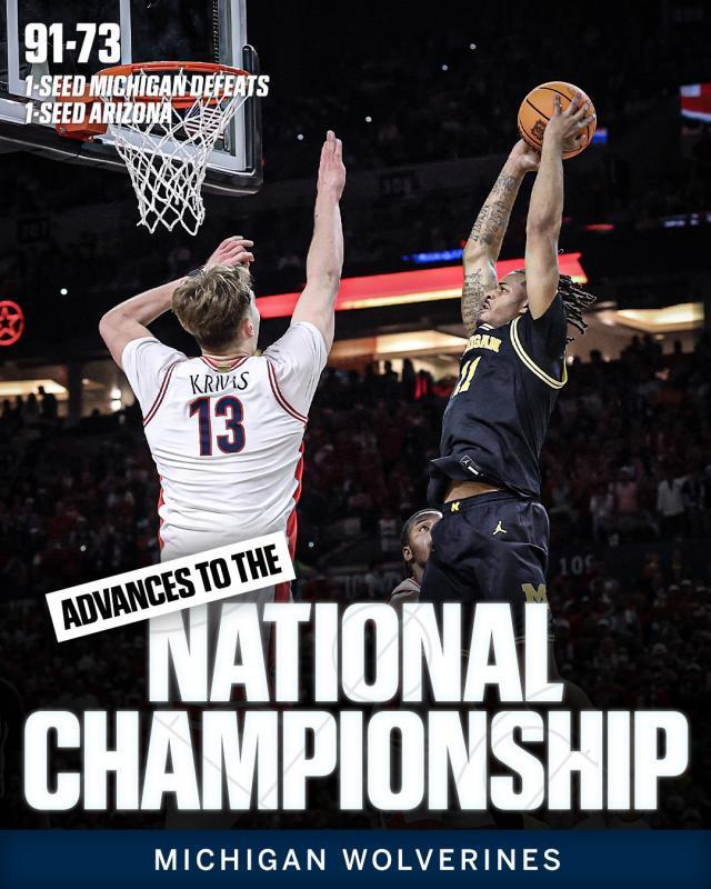 密歇根91比73大勝亞利桑那,他們全場從未落後,最多領先達到30分,並且成爲歷史首支單個錦標賽5次砍下至少90分的球隊。密歇根核心郎德伯格一度在上半場崴腳離場,但球隊並未受此影響,半場領先16分。下半場郎德伯格完成迴歸,密歇根繼續拉開分差,比賽早早失去懸念。密歇根中鋒阿達伊·瑪拉得到26分9籃板2蓋帽,控衛埃利奧特·卡多13分10助攻4搶斷;亞利桑那方面,科亞·皮特空砍16分11籃板。