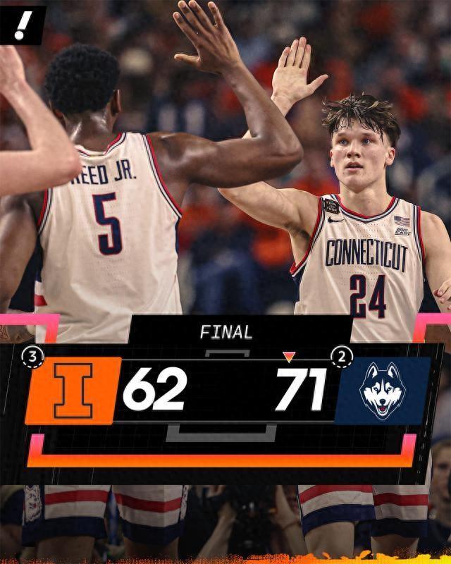 康涅狄格71比62擊敗伊利諾伊,主教練丹·赫爾利率領康大4年裏第3次打進瘋三決賽,此前2次進入決賽他們都實現奪冠。這一戰康大在上半場最後時刻逐漸拉開分差,此後便再也沒有落後過,他們最多領先達到14分。小塔里斯·裏德爲康大貢獻17分11籃板,上一輪完成神奇絕殺的穆林斯得到15分。伊利諾伊明星新生瓦格勒空砍20分8籃板2助攻。