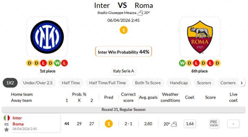 國際米蘭30輪過後積69分高居意甲榜首,領先本場對手羅馬15分,聯賽爭冠優勢明顯。