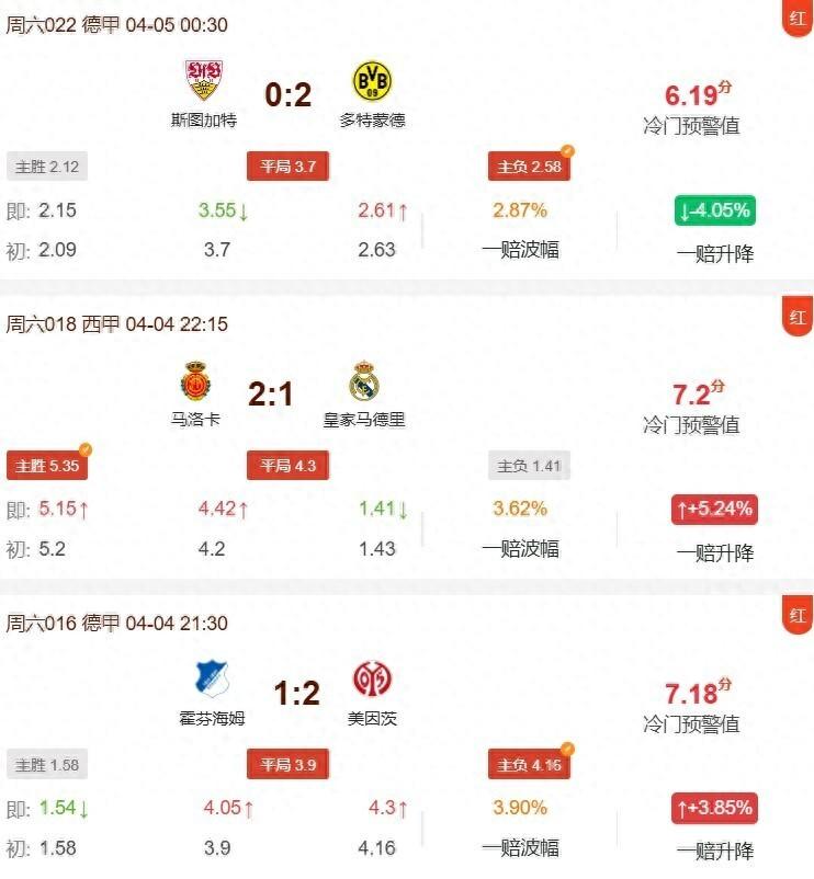 昨日冷門預警表現亮眼,公推斯圖加特0:2不敵多特蒙德順利命中。私推方面同樣精準,不僅捕捉到馬洛卡2:1擊敗皇家馬德里的大冷門,還成功預判霍芬海姆1:2負於美因茨(主勝1.58、平局3.9、主負4.16),充分展現了冷門預警工具的穩定性和實戰價值。