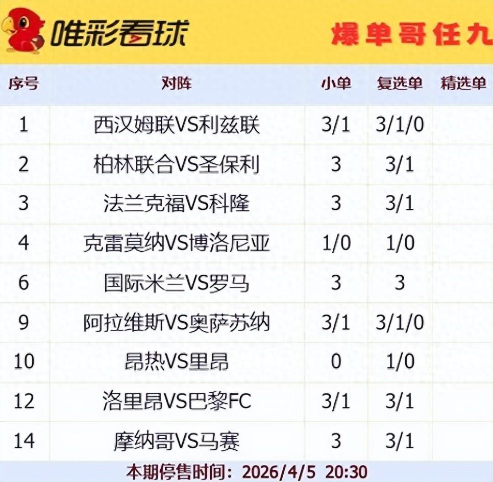 本期任九捨棄了讓步較淺、數據模糊的場次,重點鎖定足總盃、德甲、意甲、西甲及法甲中基本面清晰的比賽,力求穩健。以下是本期中幾場關鍵比賽的分析與建議: