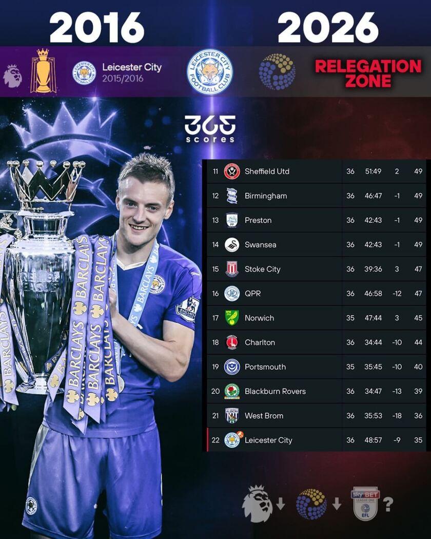 2016年,萊斯特城以5000賠1的逆天賠率登頂英超,寫下了世界足壇近代史上最震撼的草根童話。10年後的2026年,這支曾站上英格蘭之巔、闖入歐冠八強、捧起足總盃冠軍的傳奇球隊,正站在隊史最黑暗的懸崖邊——他們不僅在三年內兩次從英超降級,更在英冠賽場深陷保級泥潭,距離跌入英格蘭第三級別聯賽,只剩最後6場比賽的距離。