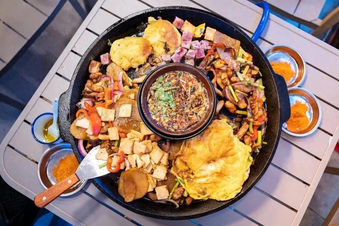 其實,現在遍佈貴州每一條食街的烙鍋,已經是個有300多年曆史的老玩意,據《水城廳志》記載,那還是當年(1664)平西王吳三桂率兵鎮壓水西彝族時,餓極了的士兵取屋頂瓦片架火烙烤野菜野味時留下的創意,到清末時逐漸演變爲中間凸起、周邊下凹的黑砂烙鍋,便於油脂分流,至此方得流傳至今。