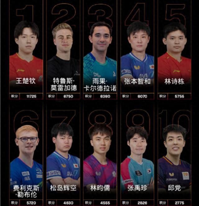 排在第二至第四位的莫雷加德、卡爾德拉諾、張本智和排名不變,因傷沒有參加澳門世界盃的林詩棟依舊位列第五,第六名屬於法國選手費利克斯·勒布倫。而在澳門世界盃一舉闖入決賽的松島輝空憑藉亞軍的成績個人排名上升至第七,無緣決賽的中國臺北名將林昀儒下降一位來到第八,韓國選手張禹珍和德國選手邱黨排名均上升一位,分列第九和第十。