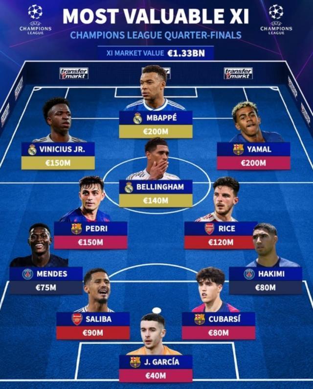 德轉列歐冠八強戰最貴陣:姆巴佩、亞馬爾領銜,皇馬3將、巴薩4人