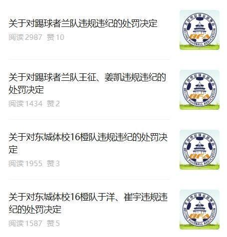 北京市足協發佈處罰決定,中青賽北京賽區U10組東城體校16橙隊和踢球者蘭隊在比賽中互射本方球門,消極比賽造成惡劣影響,均被取消賽事資格。北京足協的公告中表示:在東城體校16橙隊vs踢球者蘭隊的比賽中,下半場比賽踢球者蘭隊連續射入本方球門3球,東城體校16橙隊連續射入本方球門2球。兩隊的消極比賽造成惡劣影響,均被取消比賽資格,並被通報批評。此外東城體校16橙隊主教練崔宇、領隊於洋,踢球者蘭隊主教練姜凱、領隊王徵,也均被通報批評,並禁止參加北京市足球活動一年。