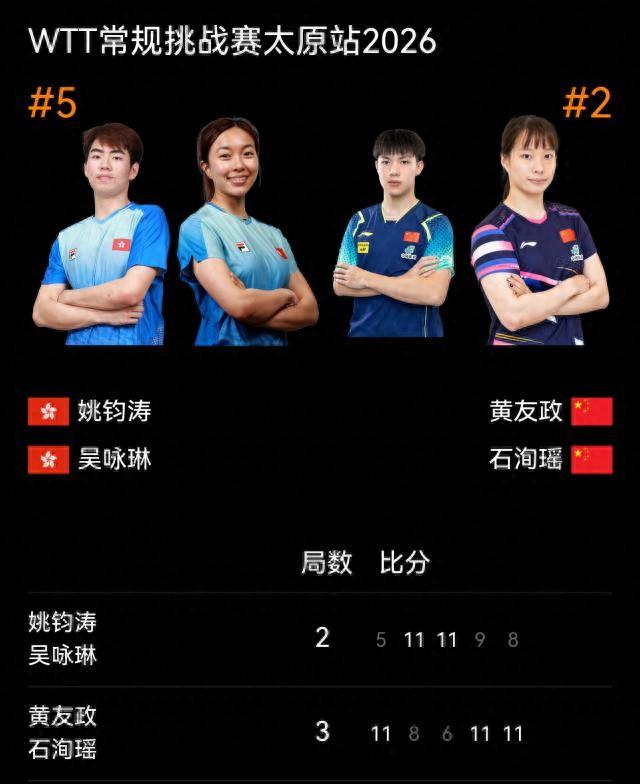 本站比賽國乒派出四對年輕混雙組合出戰,在昨天的首輪比拼中,就已經有三對摺戟——陳垣宇/覃予萱0-3完敗於日本組合坂井雄飛/高森愛央,李和宸/姚睿軒打滿五局不敵一對跨協會組合,溫瑞博/縱歌曼則是內戰輸給隊友黃友政/石洵瑤,於是後者便成爲了國乒唯一的希望。