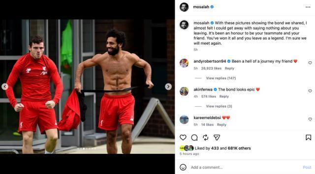在社交媒體上,薩拉赫帶頭向羅伯遜發出致敬:“看着這些照片展現的我們之間的情誼,我覺得不需要再多說什麼了。能成爲你的隊友和朋友是一種榮幸。你贏得了一切,並且以傳奇的身份離開。我相信我們一定會再見。”