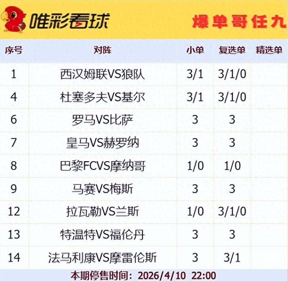 本期任九是在1場英超、1場英冠、1場德甲、2場德乙、1場意甲、1場西甲、2場法甲、3場法乙、1場荷甲和1場葡超的基礎上,捨棄了幾場讓步較淺、不確定性較高的比賽後形成的。整體來看,這期組合中既有主場優勢明顯的場次,也有保級與升級題材交織的較量,需要結合各隊近況、傷病和交鋒記錄來綜合判斷。以下是本期中幾場關鍵比賽的分析與建議: