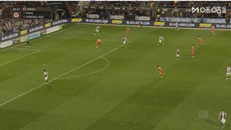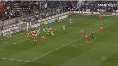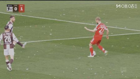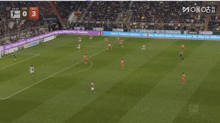 第27分鐘,聖保利門將出球失誤,拜仁前場斷球后將球給到穆西亞拉,後者稍作調整後一腳爆射擊中立柱。