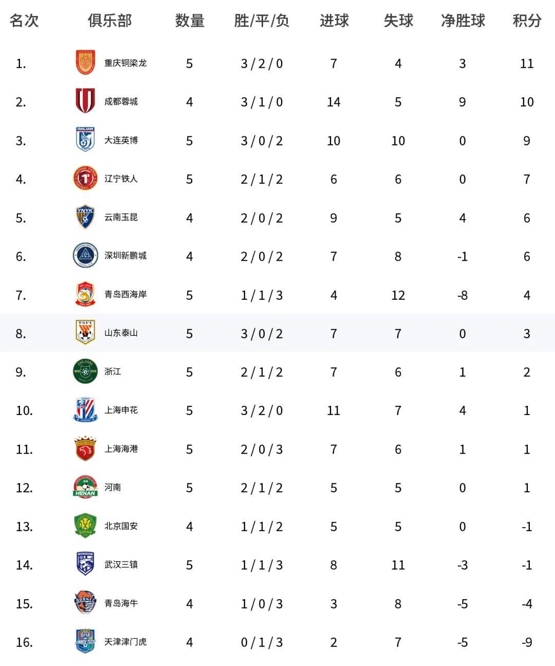 隨着本場失利的到來,武漢三鎮的處境愈發艱難。中超前五輪戰罷,球隊進8球丟11球,受罰分影響,積分仍爲負1分,排名暫列第13位,已無限接近降級區。反觀對手重慶銅梁龍,取勝後以3勝2平的不敗戰績暫登積分榜首,昔日冠軍與升班馬的落差令人唏噓。