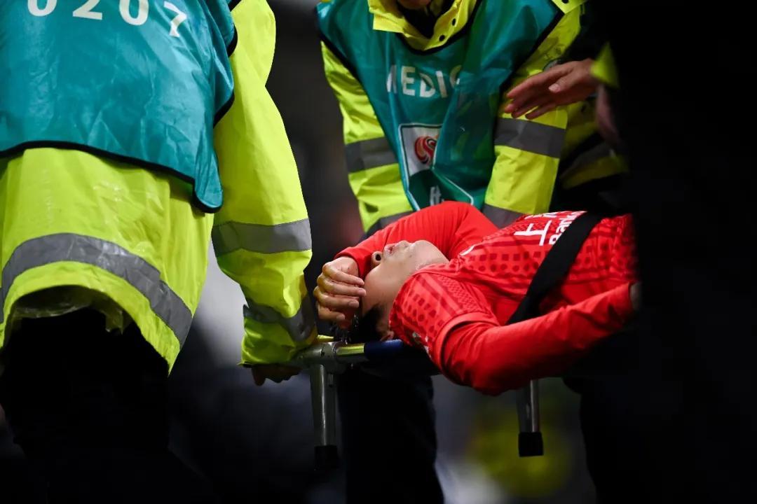 海港隊醫進場後,楊世元捂住了自己的頭部,海港申請腦震盪換人。