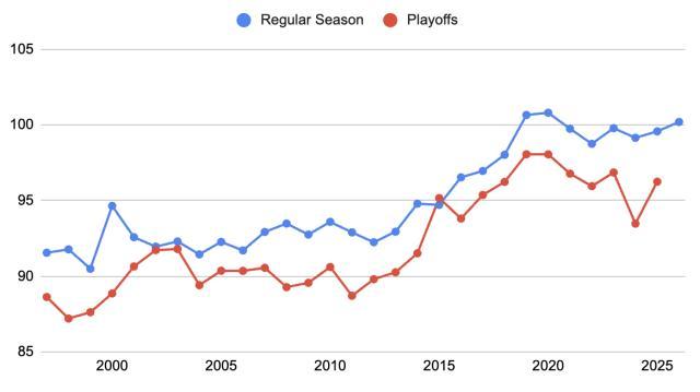 總體而言,隨着比賽重要性的提升,節奏往往會放慢。自1996-97賽季以來的28個賽季中,有27個賽季的季後賽節奏都低於常規賽。平均來看,季後賽每48分鐘的回合數會減少2.7次。這並不是因爲進入季後賽的球隊本身節奏更慢,而是季後賽環境導致的變化。