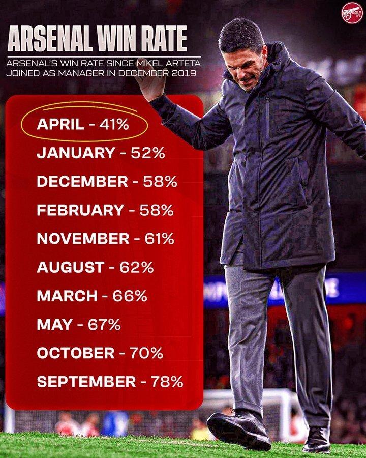 一個事實足以讓任何阿爾特塔的辯護者閉嘴:執教阿森納期間,阿爾特塔在四月的勝率僅爲42%,是他所有月份中最低的。而四月,恰恰是瓜迪奧拉執教曼城以來勝率最高的月份,高達79%。曼城過去38場四月聯賽贏了30場,勝率逼近八成,阿森納卻在同一個月份習慣性地“自爆”。
