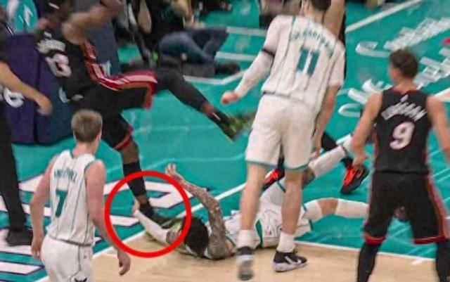 鮑爾的左手直接拉在阿德巴約的支撐腳左腳上,導致後者失去重心,摔倒在地。這次重摔倒地顯然讓阿德巴約的尾椎骨或腰部、胯部區域遭受重創。阿德巴約離場,裁判並沒有進行回放升級鮑爾的犯規。