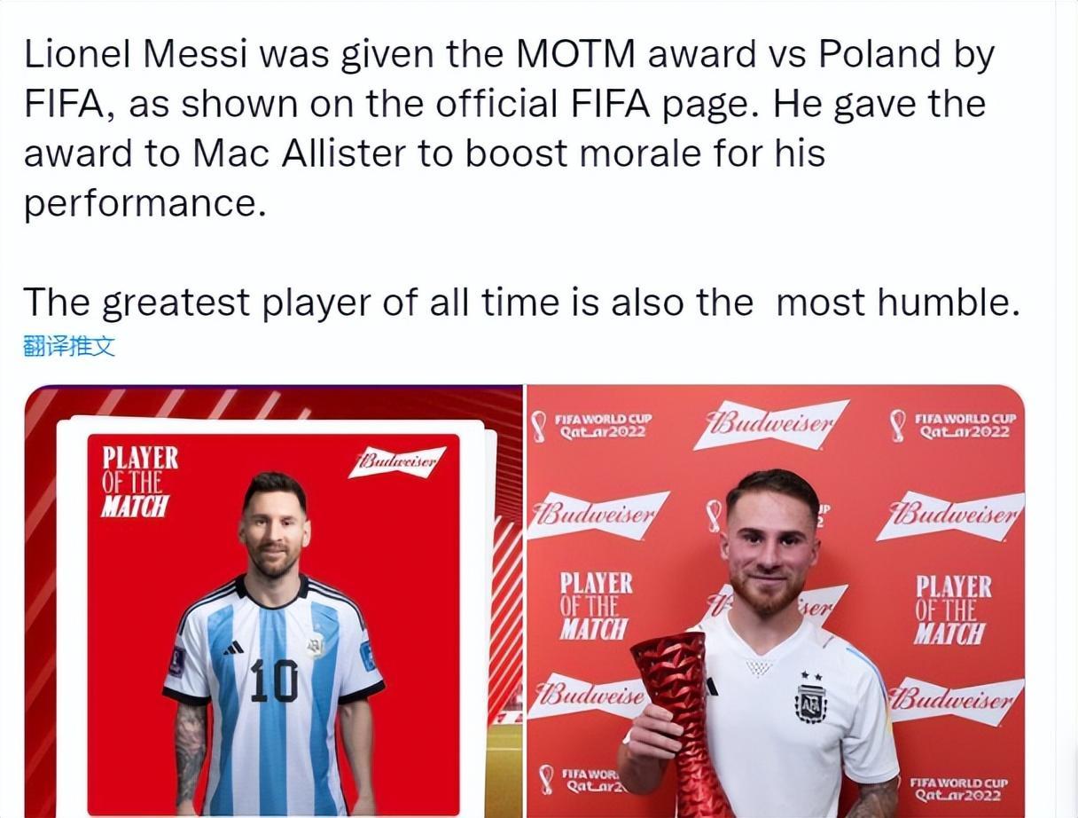 儘管罰丟了一個點球,但35歲的梅西仍然獲得FIFA官方評選的全場最佳球員。梅西卻拒絕領獎,接下來一個舉動被球迷大讚高情商,那就是他主動把這一個獎盃交給了爲球隊打進首開紀錄進球的麥卡利斯特。