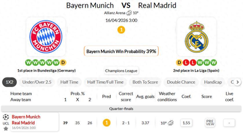 本次對決首回合交鋒,拜仁在皇馬主場拿到2-1的勝利。