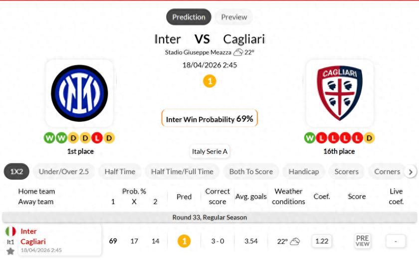 領跑積分榜的國際米蘭主場迎戰保級球隊卡利亞里,藍黑軍團能否拿下3分繼續鞏固奪冠優勢,卡利亞里客場能否爆冷搶分脫離降級區,本場對決懸念十足,極具看點。