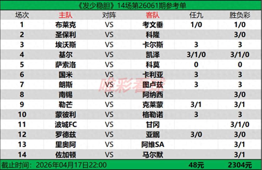 【發少穩膽26061期勝負彩14場(2304元)任九(48元)推薦方案】