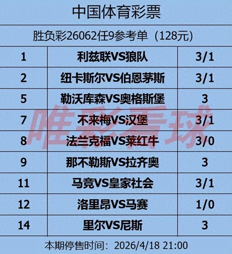 姜山:本場對決,萊比錫狀態火熱、攻防俱佳,客場表現強勢,整體實力佔優。法蘭克福雖主場穩健、搶分戰意強烈,但攻防中庸且傷停纏身。先看法蘭克福這邊,球隊目前以42分位列德甲第7,29輪戰罷取得11勝9平9負,得失球均爲54球,攻防兩端表現中庸。球隊落後第6的霍芬海姆9分,仍有衝擊歐戰的希望,搶分慾望十分強烈。主場是球隊的主要拿分陣地,14個主場7勝3平4負,拿到24個積分,最近4個主場保持不敗,斬獲3勝,主場氣勢正盛。球隊近期狀態起伏較大,近3場1勝1平1負,上輪客場2-1擊敗沃爾夫斯堡止住頹勢,此前主場2-2戰平科隆、客場1-2不敵美因茨,3場比賽得失球均爲5球,防守端的不穩定性凸顯,缺乏持續壓制力。傷停方面,主力右邊鋒堂安律缺陣,這名本賽季出戰28場、爲球隊提供重要進攻支撐的核心缺席,將直接削弱球隊邊路進攻與終結能力,此外中衛科林斯、右邊衛克里斯滕森、左邊鋒巴霍亞也無法出戰,多條戰線受損,陣容厚度受影響。歷史交鋒上,兩隊最近6次交手法蘭克福2勝1平3負,本賽季首回合客場0-6慘敗,不過最近兩次主場對陣萊比錫保持不敗,1勝1平,心理層面有一定主場底氣。再看萊比錫紅牛這邊,球隊以56分高居德甲第4,29輪取得17勝5平7負,攻防兩端展現頂級水準,已鎖定歐冠正賽資格,士氣正盛。球隊近期狀態火熱,近3場豪取三連勝,先後擊敗門興、不來梅和霍芬海姆,進8球僅失1球,其中5-0大勝霍芬海姆凸顯強大進攻火力,還實現連續兩場零封,防守端固若金湯。客場作戰能力出色,14個客場7勝3平4負,最近4個客場拿到3勝,異地作戰競爭力強勁。陣容方面存在隱患,主力中前衛施拉格累計黃牌停賽,這名本賽季23場聯賽首發18次的中場支柱缺席,將影響球隊中場組織與串聯,主力中衛盧克巴因左側內收肌受傷短期缺陣,作爲球隊後防核心,他的缺席會削弱防線穩定性,給球隊防守帶來不小壓力。歷史交鋒上,萊比錫整體佔優,兩隊歷史交手萊比錫5勝2平3負,本賽季首回合大勝,心理層面有一定優勢。綜合來看,萊比錫狀態火熱、攻防俱佳,客場戰力強勁,雖有核心傷停隱患,但整體實力仍佔優。法蘭克福主場穩健、戰意強烈,雖傷停較多、攻防中庸,但主場有一定抗衡力,且歷史主場對陣萊比錫不敗。結合兩隊歷史交鋒多分出勝負、近期走勢均偏強勢的特點,本場看好兩隊分勝負。