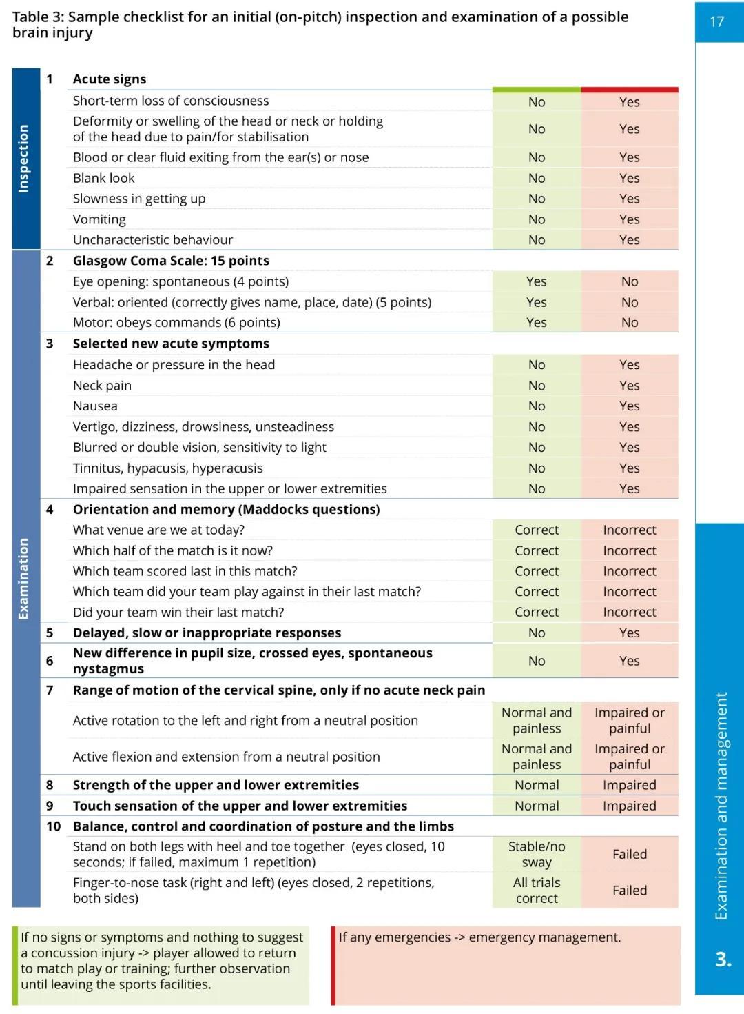 事實上,在國際足聯2024年頒佈的《國際足聯腦震盪協議醫療人員版》的規定中,檢查球員是否有腦震盪風險有着嚴謹的評估標準。國際足聯建議使用最新版本的運動腦震盪評估工具(SCAT,目前爲第6版),SCAT6是國際體育界應用最廣泛的評估工具,它提供一系列多模式測試,用於評估腦震盪通常會受損的多個腦功能方面。該工具可測量意識、定向力、神經認知功能、自我報告的症狀和姿勢穩定性,尤其是急性腦震盪的評估,可以記錄腦震盪的可觀察體徵,包括危險信號、格拉斯哥昏迷評分和頸椎功能,以及神經系統篩查檢查。