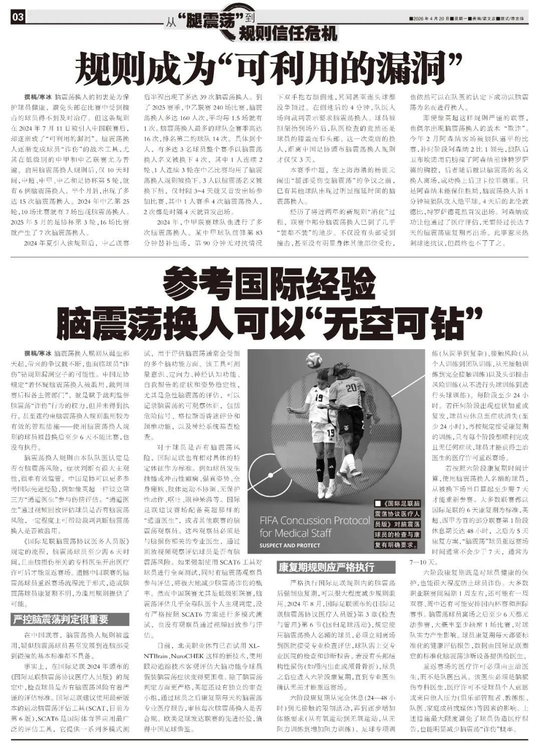 撰稿/寒冰 腦震盪換人規則從誕生那天起,帶來的爭議就不斷,也面臨球員“詐傷”鑽規則漏洞空子的可能性。中國足協規定“若懷疑腦震盪換人被濫用,裁判須賽後報備主管部門”,就是賦予裁判監督腦震盪“詐傷”行爲的權力,但並未得到執行。甚至連約束腦震盪換人規則濫用較爲有效的管理措施——使用腦震盪換人規則的球員被替換後至少6天不能比賽,也沒有執行。