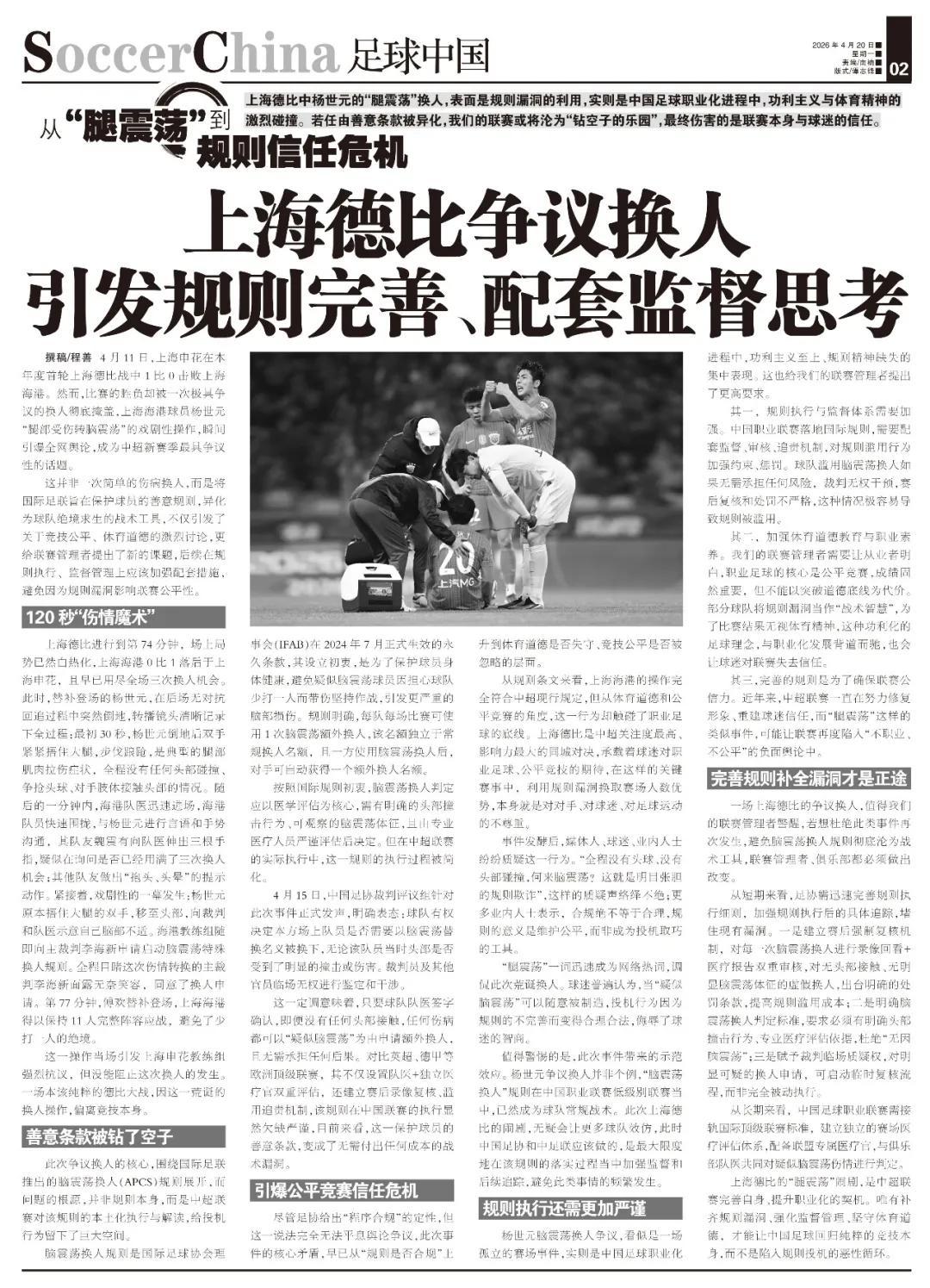 上海德比的“腿震盪”鬧劇,是中超聯賽完善自身、提升職業化的契機。唯有補齊規則漏洞、強化監督管理、堅守體育道德,才能讓中國足球迴歸純粹的競技本身,而不是陷入規則投機的惡性循環。