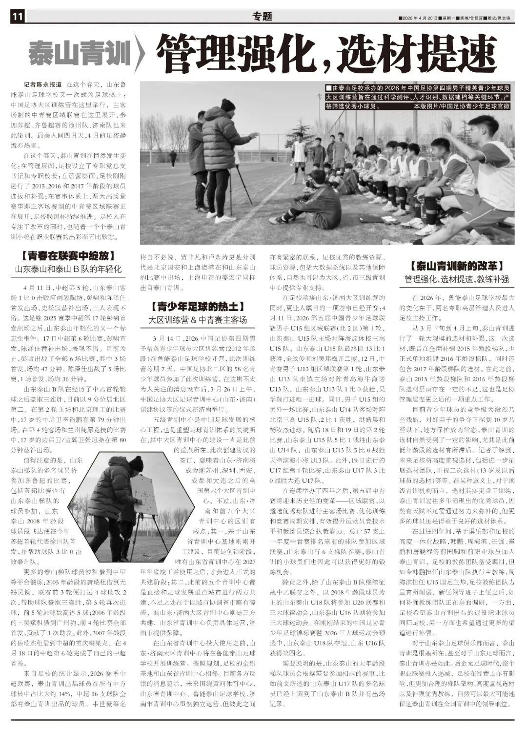 目前青少年球員的競爭極爲激烈乃至殘酷,對好苗子的爭奪下探到10歲乃至以下,地方保護成爲常態,泰山青訓的選材自然受到了一定的影響,尤其是此前低年齡段的選材有所滯後。記者瞭解到,未來足校將高度重視選材,包括進一步拓展選材團隊,重視二次選材(13歲及以後球員的選材)等等。在某種意義上,對於頂級青訓機構而言,選材其實更重於訓練,泰山青訓過往多年湧現出的優秀球員,固然有天賦不足需通過努力來彌補的,但更多的球員還是得益於良好的選材體系。