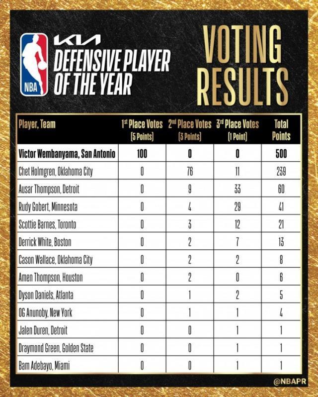 文班亞馬獲得了所有的100張第一選票,成爲NBA歷史上DPOY設立以來首位全票當選的球員。