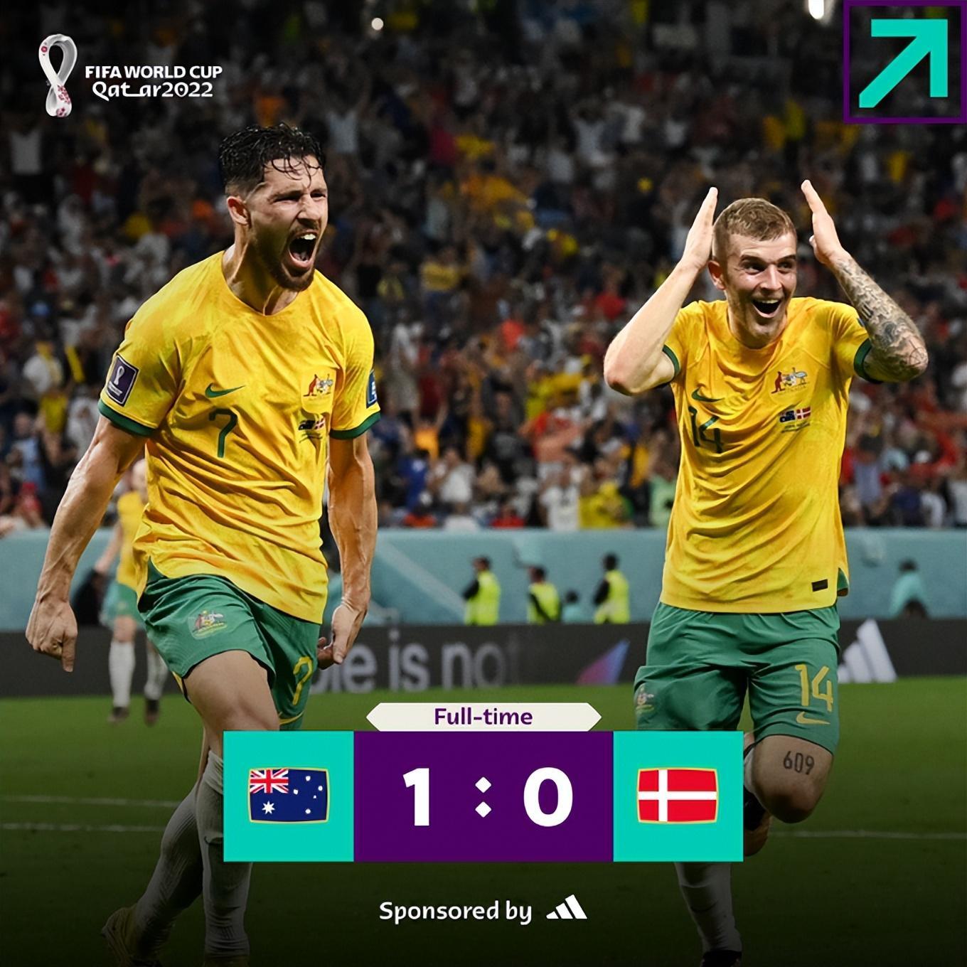 小組賽末輪前,雖然積分排在第2位,手握出線主動權,但因淨勝球偏少,澳大利亞必須提防必然輪換的法國隊爆冷。所以他們要擊敗歐洲勁旅丹麥全取3分,才能確保出線資格。阿諾德選擇信任此前擊敗突尼斯的首發陣容,但兩隊想贏怕輸的心態讓比賽始終處於僵持狀態。直到第58分鐘突尼斯進球,北非雄鷹反超澳大利亞暫時排名第2,兩隊纔開始放手一搏。澳大利亞人把握住了機會,第60分鐘萊基在反擊中擺脫兩名丹麥中衛防守一蹴而就,讓亞洲足球在這屆亞洲世界盃至少擁有1支16強球隊。