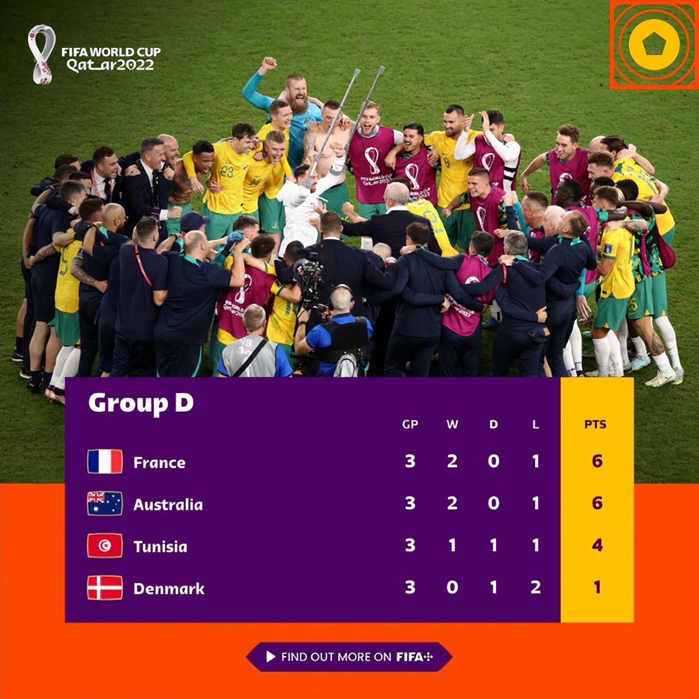 而在D組,賽前被普遍看低的澳大利亞後來居上,首戰1比4慘敗衛冕冠軍法國後,以連續兩個1比0的最高性價比勝利,擊敗突尼斯和歐洲勁旅丹麥,2006年以來第2次進入世界盃16強。澳大利亞也創造了另一個紀錄:袋鼠軍團是首支分別代表兩個大洲均進入世界盃16強的球隊。