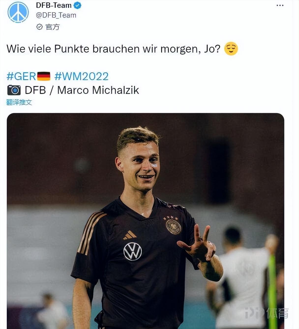 北京時間明天凌晨,德國將在世界盃小組賽最後一輪比賽中對陣哥斯達黎加。德國1平1負僅積1分,目前排名E組墊底,此役他們只有取勝纔可能小組出線。德國隊官方賬號在社交媒體上曬出基米希伸出三根手指的照片,並寫道:“約書亞(基米希),明天我們需要多少分?”