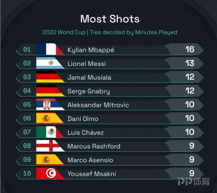 世界盃小組賽階段比賽結束,Squawka統計了球員的射門次數,並列出榜單,姆巴佩16次射門最多,梅西13次射門排名次席。世界盃小組賽射門榜:姆巴佩(法國)——16梅西(阿根廷)——13穆西亞拉(德國)——12格納布里(德國)——12米特洛維奇(塞爾維亞)——10奧爾莫(西班牙)——10查韋斯(墨西哥)——10拉什福德(英格蘭)——9阿森西奧(西班牙)——9姆薩克尼(突尼斯)——9