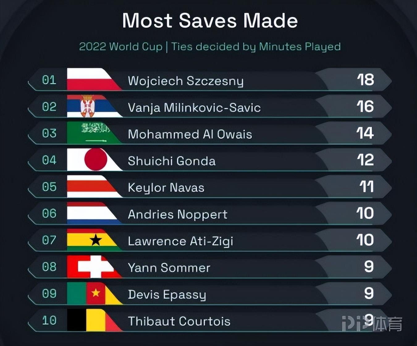 12月3日凌晨,卡塔爾世界盃小組賽階段的比賽全部結束。隨即,Squawka統計了各隊門將的撲救次數,在這份榜單中,波蘭門將什琴斯尼以18次撲救居首,塞爾維亞門將薩維奇以16次撲救排名第二,日本門將權田修一排名第四。