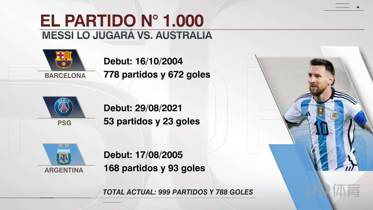 北京時間12月4日凌晨3點,世界盃1/8決賽,阿根廷將對陣澳大利亞。本場比賽將是梅西職業生涯第1000場比賽,此前999場,梅西打進788球,送出385次助攻。具體如下:巴薩生涯:778場672球303助攻巴黎生涯:53場23球29助阿根廷國家隊:168場93球53助