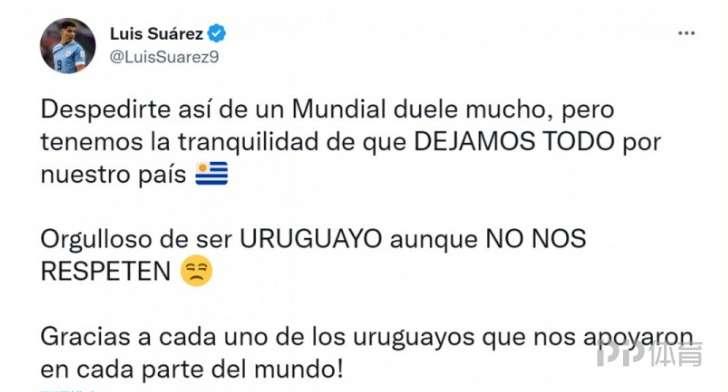 烏拉圭在世界盃小組賽最後一輪比賽中2比0擊敗加納,但仍然無緣出線,烏拉圭前鋒蘇亞雷斯在社交媒體上談到了這次世界盃之旅。蘇亞雷斯曬出自己的比賽照片,並寫道:“以這樣的方式告別世界盃讓人很傷心,但我們的內心卻很平靜,我們已爲祖國竭盡全力。”“身爲烏拉圭人感到驕傲,儘管他們不尊重我們。感謝在世界各地支持我們的每一位烏拉圭人!”