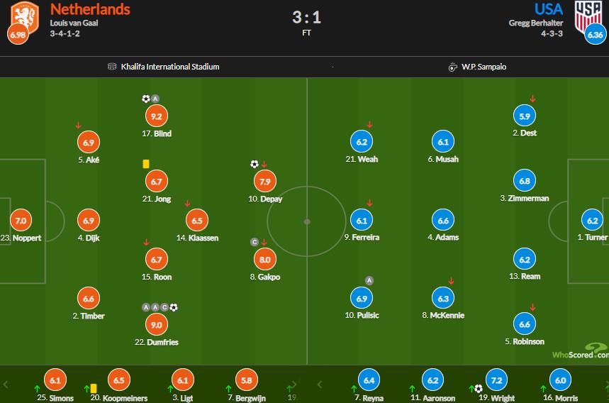 第3分鐘,亞當斯斷球后挑傳禁區,普利西奇跟進左腳推射被諾珀特撲出、第10分鐘,鄧弗里斯右路傳中,德佩插上右腳抽射破門,荷蘭1-0領先美國。