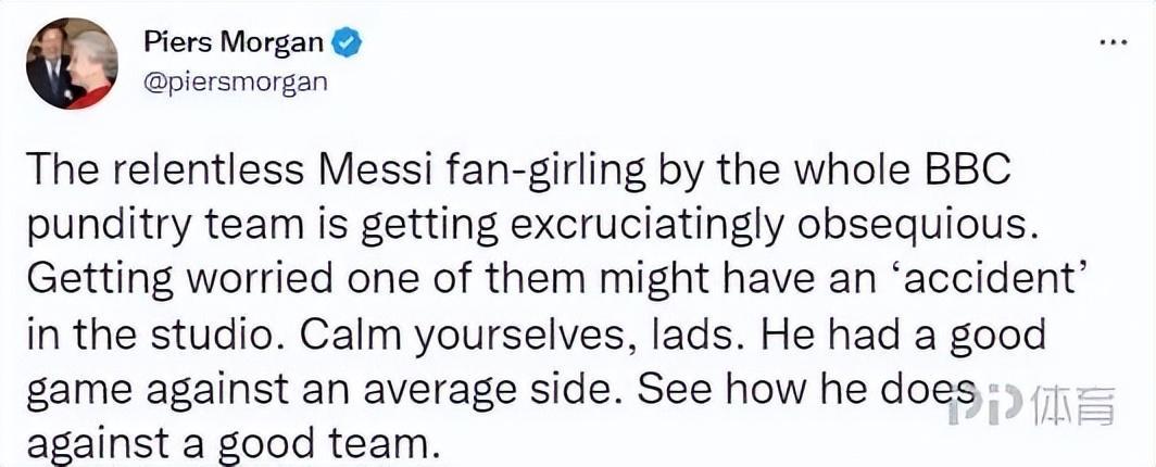 今晨世界盃1/8決賽,阿根廷2-1淘汰澳大利亞,梅西千場里程碑破門率隊晉級八強。摩根在賽後發推表示:整個BBC專家團隊對梅西的狂熱追捧變得令人難以忍受。擔心他們中的一個可能會在工作室發生“事故”。冷靜點,小夥子們。他在對陣一支一般的球隊的比賽中表現出色,看看他面對一支優秀的球隊表現如何吧。